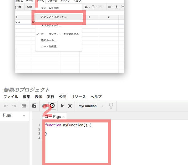 スクリプトエディタにデフォルトでmyFunction()という関数が用意されてますのでここを編集していきます。