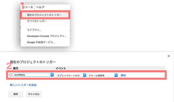 エディタの上にあるメニューのリソースから、現在のプロジェクトのトリガーをクリックします。