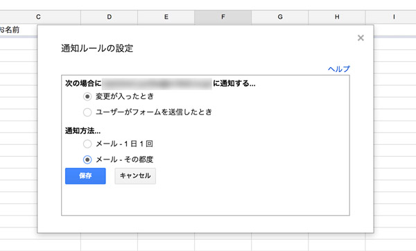 次の場合にメール(通常ご自身のGMAIL)に通知するの項目に「変更が入ったとき」、通知方法の項目に「メール – その都度」にもチェックを入れておきます。
