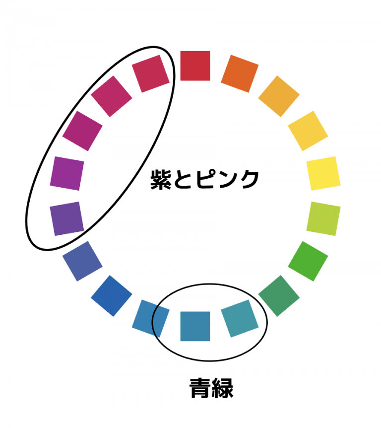 特定の色相を切り捨てるというのは乱暴な話かもしれません。おそらく色彩関係の教科書にはそんなことかかれていないでしょう。紫やピンクは女性ターゲット向けのサイトには最適ですし、青緑もきれいな海のイメージがあり同系色ならまとまります。また、パステルカラーや、ダークトーン配色のようにトーンを揃えればうまく使えると思います。