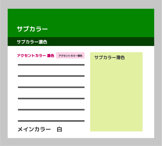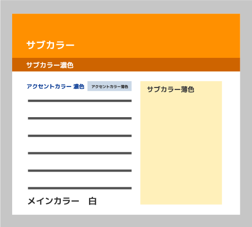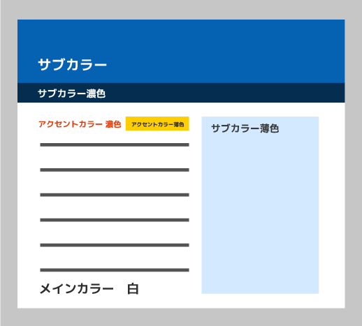 有彩色(青)一色とモノトーン(白黒グレー)だけです。写真やバナーで否応なしに色は増えますので、土台はこれだけでも十分です。これならまず色で破綻することはありません。モノトーンを準無彩色(茶系やブルーグレー系)に変えても大丈夫です。
